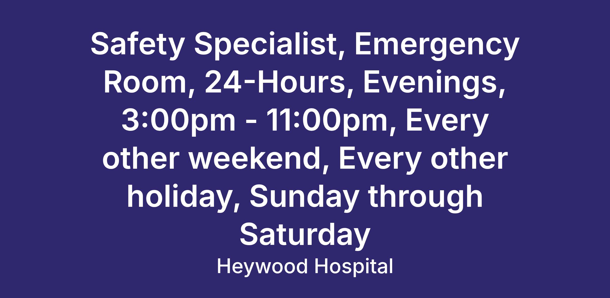 Hours: 24-Hours, Evenings, 3:00pm - 11:00pm, Every other weekend, Every other holiday, Sunday through Saturday